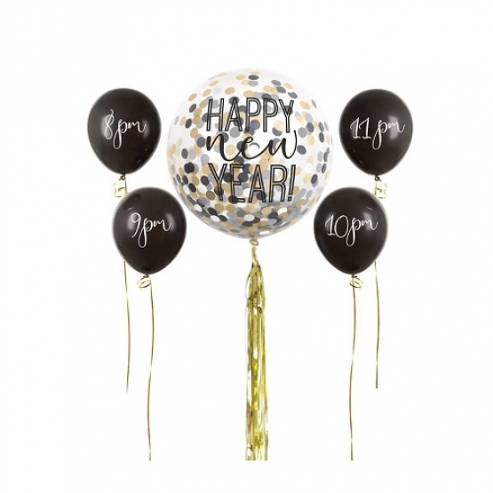 Contains: 1 - 24" Giant Printed (Happy New Year) Latex Balloon, 1 - Balloon Tail (6' long), Paper Confetti & 4 - 12" Printed (8 PM, 9 PM, 10 PM & 11 PM) Latex Balloons