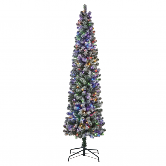 Slim and versatile. Featuring 200 energy-efficient, multi-colour LED bulbs, can be programmed to change colour or cast a consistently warm white glow. Charming artificial snow dusts the 408 realistic PVC branches of this gorgeously designed 7 foot tall 26" diameter artificial Christmas tree.